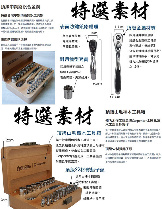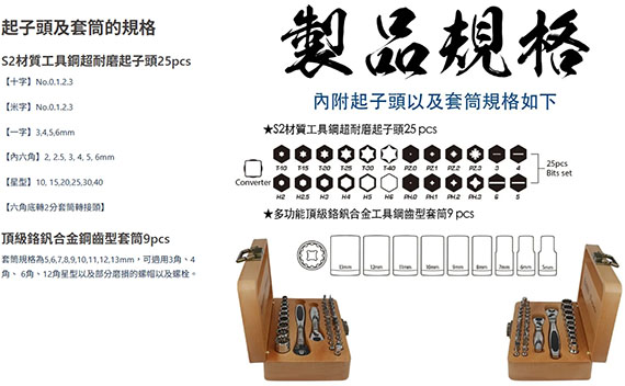 2分=1/4英吋的套筒尺寸,木格調的紳士質感,雙手柄設計,特選台灣中鋼頂級鉻釩工具鋼,表面防鏽鍍鉻處理,頂級山毛櫸木工具箱,頂級S2材質起子頭25pcs,特殊精密棘輪製作技術,流線型的絕美設計,可維修式精密棘輪功能,快脫按鈕,鉻釩合金鋼齒型套筒9pcs,木盒/工具產地:台灣