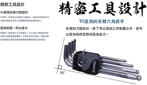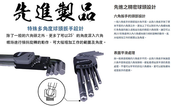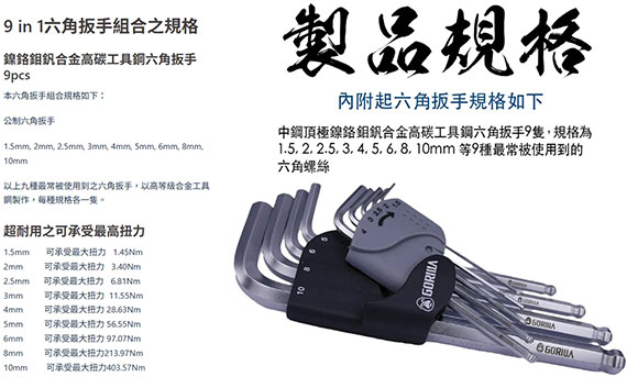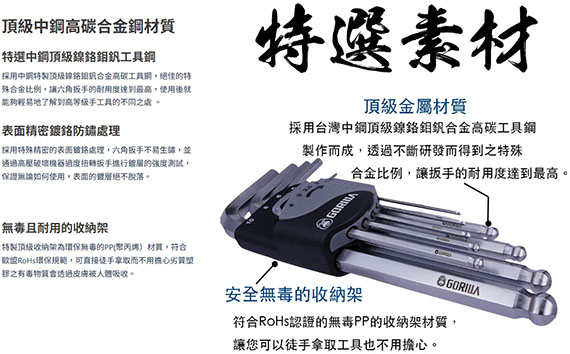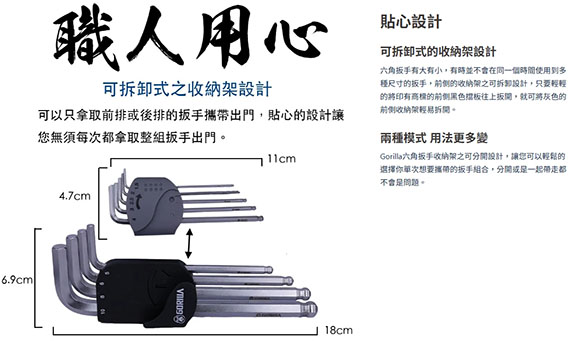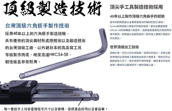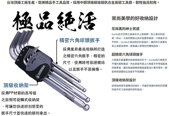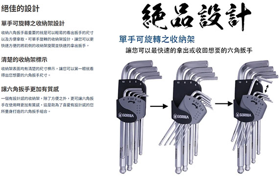 【上一個】【下一個】 | GORILLA 9合1精密耐用公制六角球頭扳手組 014-G051