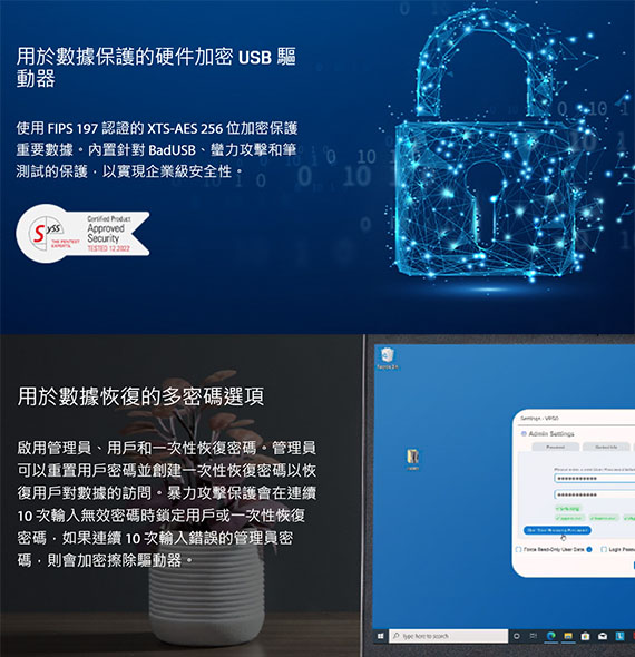 用於數據保護的 FIPS 197 認證和 XTS-AES 256 位加密 USB 驅動器