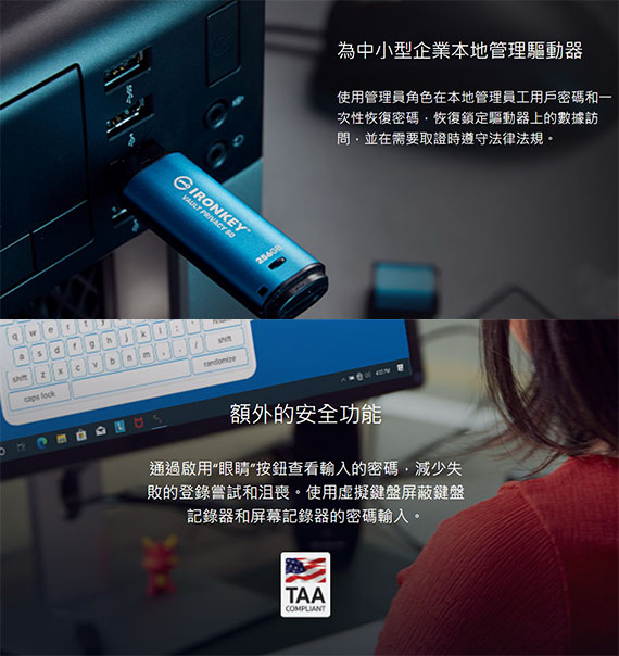 Vault Privacy 50 防水,IPX8 等級3個,符合 TAA 標準,並在美國組裝。