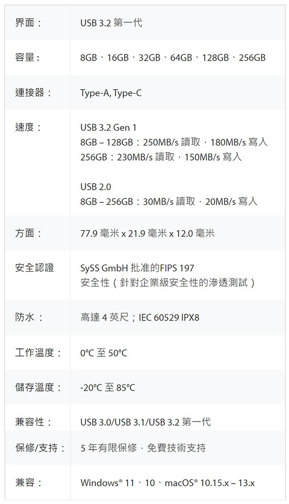 USB-A 3.2 Gen 1介面, 讀取速度高達250MB/s,寫入速度高達180MB/s, AES-256 XTS加密,FIPS 197認證,多重密碼選項,具有複雜/密碼模式,適用客製化方案,五年保固和免費技術支援服務 BSMI認證碼: D43254