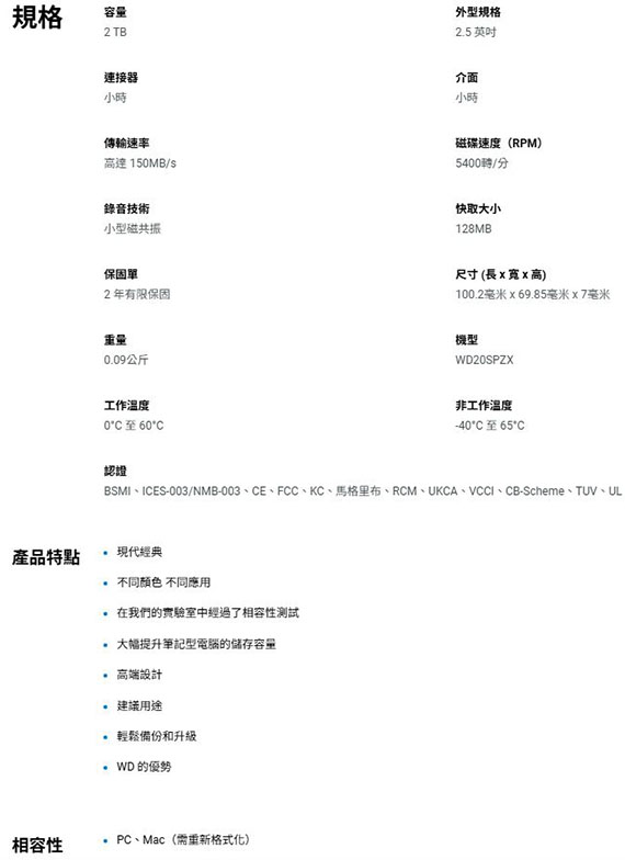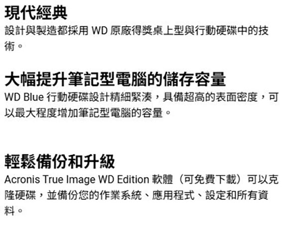 SATA 6.0Gb/s介面,5400RPM 轉速,128MB 快取記憶體,外殼厚度超薄7mm,Acronis True Image WD Edition 軟體,藍標(Blue)系列,2.5 吋,三年保固