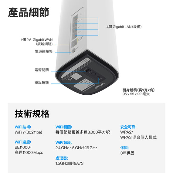 三頻WIFI 7技術、傳輸速度高達10Gbps、覆蓋範圍高達9000平方英尺、介面:2.5Gigabit WAN*1、1Gigabit LAN*4、1.5GHz四核心處理器、壓鑄底座和鋁散熱器、超寬320MHz頻段和4K QAM、WPA2/WPA3混合個人模式、三年保固 NCC認證碼: CCAF24LP1760T5