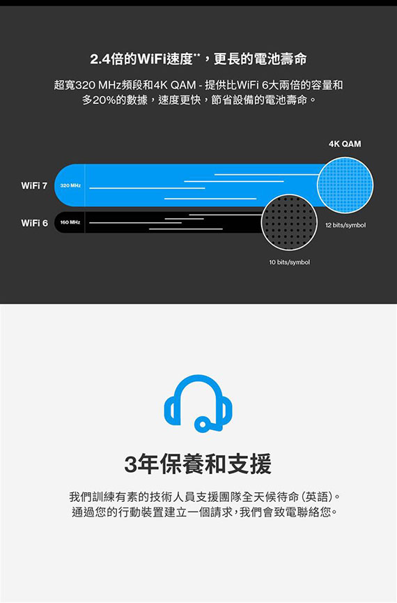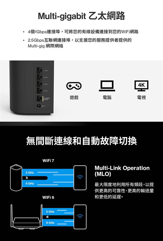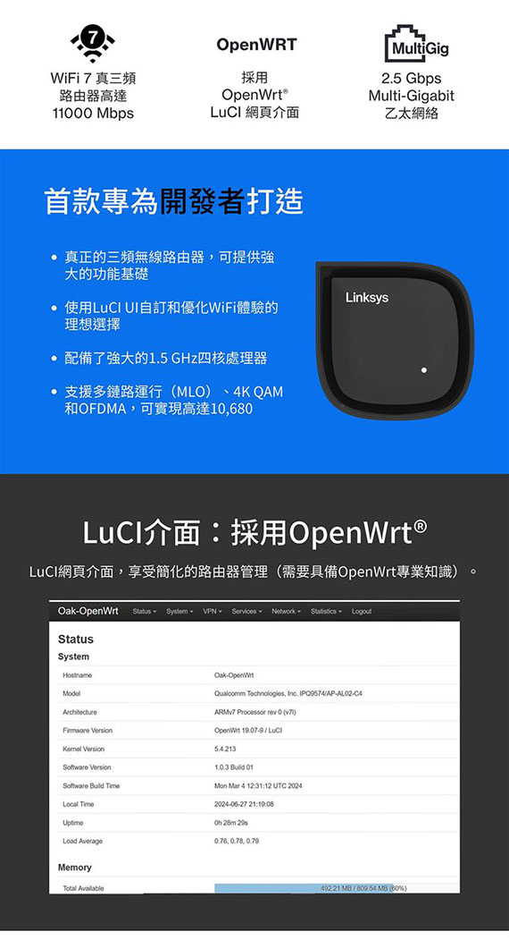 三頻WIFI 7技術、傳輸速度高達11Gbps、支援多鏈路運行(MLO)、4K-QAM和OFDMA、覆蓋範圍高達9000平方英尺、介面:10Gigabit LAN*4、2.5Gigabit WAN*1、1.5GHz四核心處理器採用OpenWrt LuCI UI網路介面、三年保固 NCC認證碼: CCAF24LP176AT7