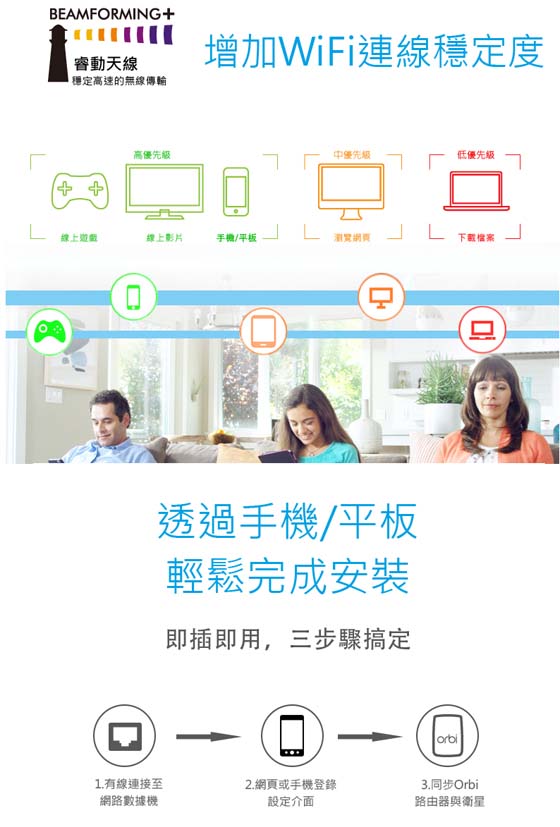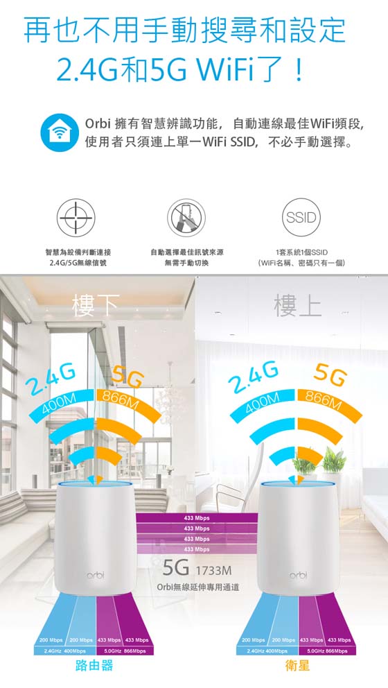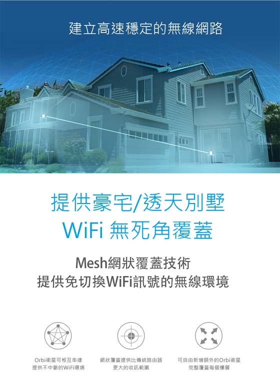 AC3000三頻段同步發射WiFi (1733 + 866 + 400 Mbps),六組高性能內置天線與高功率訊號放大器,Mesh技術搭載自動切換最佳訊號源,支援MU-MIMO功能,兩件一組約可覆蓋110坪的使用範圍,可用手機、平板或是電腦快速完成設定,LED燈號指示