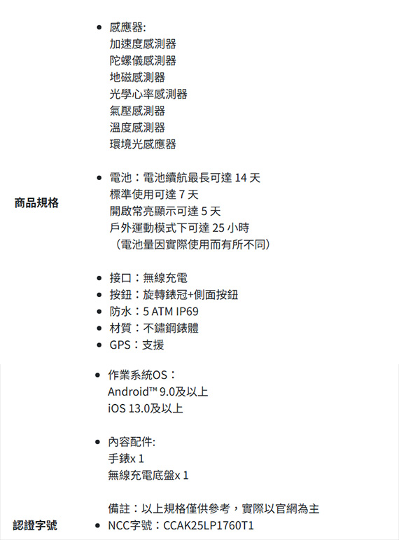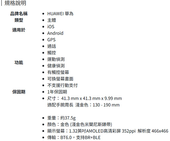 1.32吋AMOLED螢幕,466×466pixels,3000-nits 超高亮度,重量約37.5克,適用手腕尺寸130-190 mm,產品尺寸41.3x41.3x9.99mm,無線充電,5 ATM/IP69 防水等級,支援 BT6.0 和 BR+BLE, 感應器:加速度/陀螺儀/地磁/光學心率/氣壓/溫度/環境光,1年保固