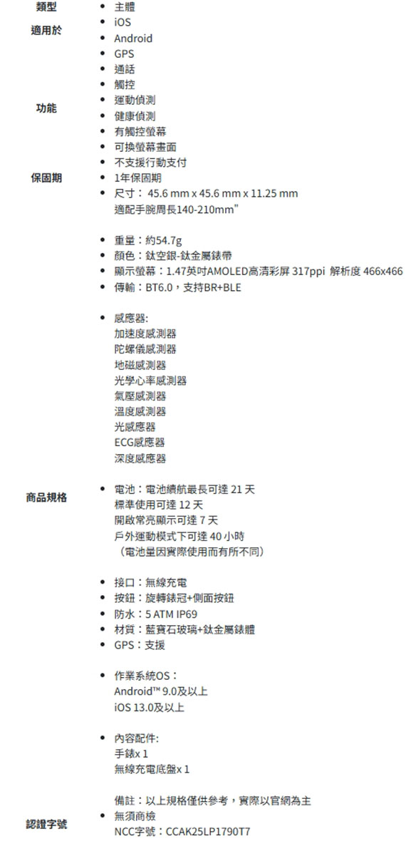 1.47吋AMOLED螢幕,466×466pixels,3000-nits 超高亮度,重量約54.7克,適用手腕尺寸140-210 mm,產品尺寸45.6x45.6x11.25mm,無線充電,5 ATM/IP69 防水等級,支援 BT6.0 和 BR+BLE, 感應器:加速度/陀螺儀/地磁/光學心率/氣壓/溫度/光感應/ECG/深度,1年保固