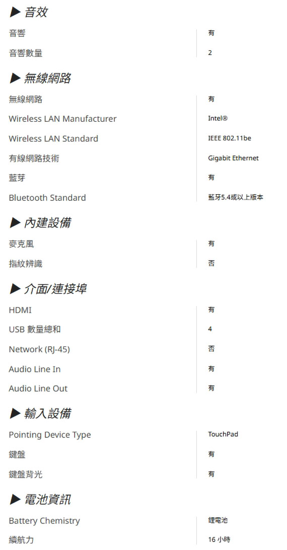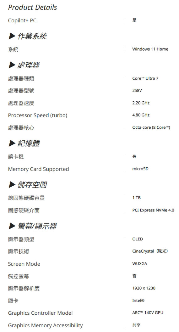 14吋,解析度WUXGA 1920x1200,16:10/OLED/鏡面,60Hz,Intel Core Ultra 7 processor 258V,32GB LPDDR5X(Onboard),1TB PCIe Gen4 SSD,光碟機外接請選購,Bluetooth 5.4,RJ-45,USB Type-C*2,USB Type-A*2,HDMI 2.1*1,音訊孔,Card Reader,1.24 kg,含鼠包,Windows 11家用版64位元、二年保固