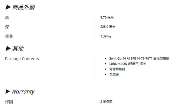 Acer宏碁 Swift Go SFG14-75-76T1 (14吋/U7-258V/32G/1T/Home/1.24kg/含鼠包)