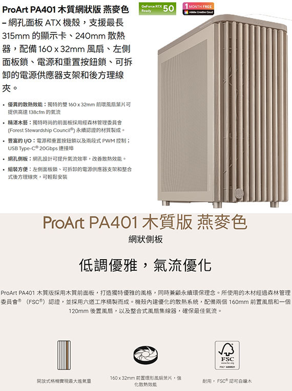 ASUS華碩 ProArt PA401 Wood 木質版 網狀側板 燕麥色 ATX機殼