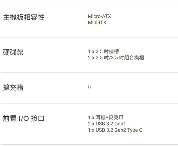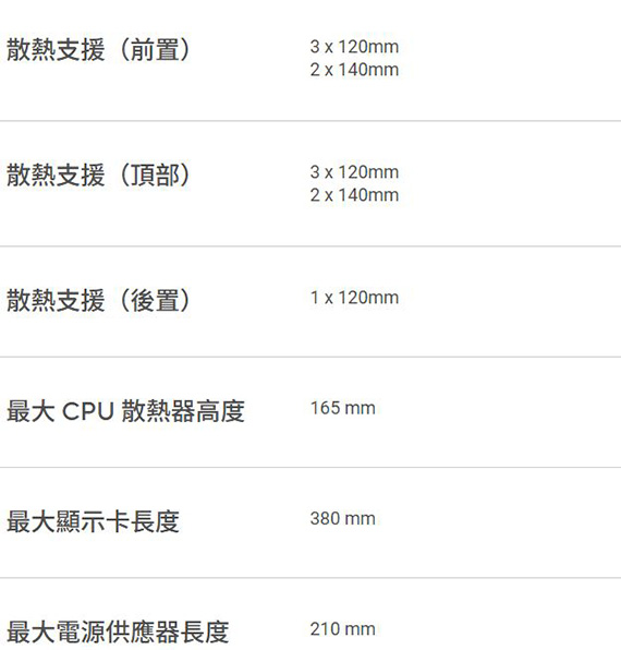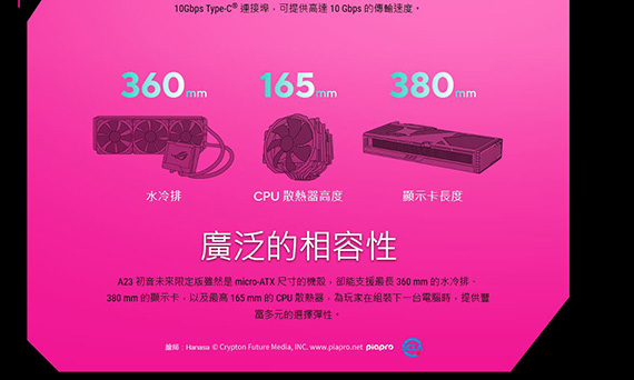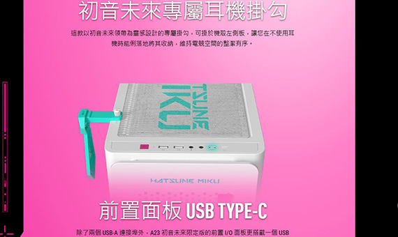 2.5吋*1,2.5 吋/3.5 吋*2,適用主機板:Micro-ATX/Mini-ITX,支援CPU散熱限高165mm,顯卡VGA限長380mm,支援最長 210 mm ATX 電源供應器,支援風扇:後板120mm*1,上板120mm*3/140mm*2,前版120mm*3/140mm*2,支援水冷:後板120mm,上板120mm/140/240/280/360mm,前版120mm/140/240/280/360mm,I/O介面:Type-C USB3.2 Gen2*1,USB3.2 Gen1*2,耳機+麥克風*1,免工具側板,寬廣33mm的收納整線空間,尺寸479 *220*450mm,初音未來專屬耳機掛勾,2年保固