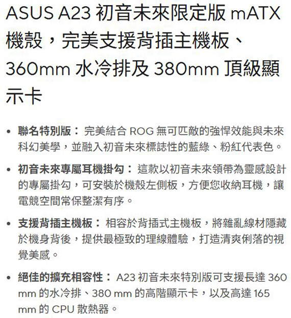 ASUS華碩 Prime A23 MIKU White Edition 初音未來限定版 玻璃透側 M-ATX 機殼