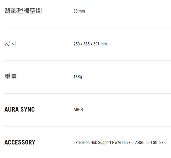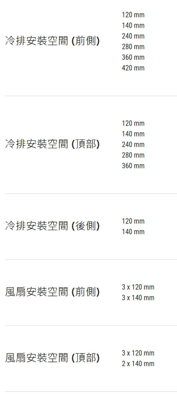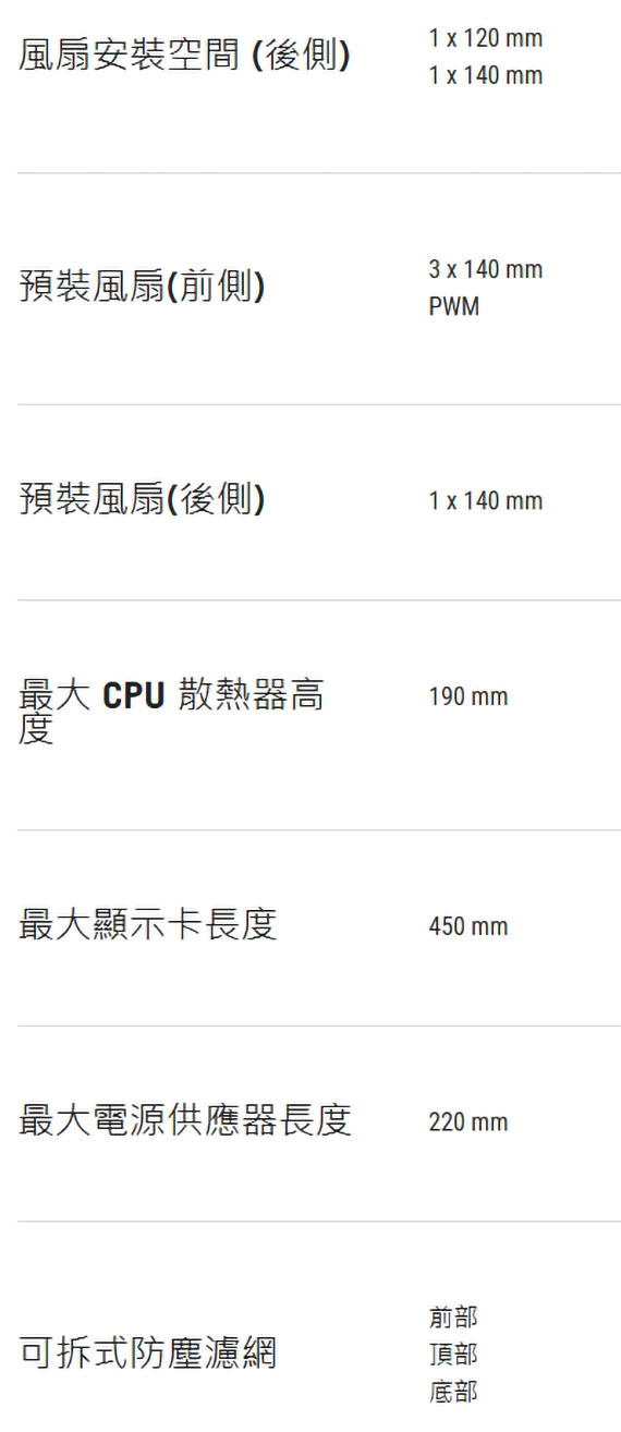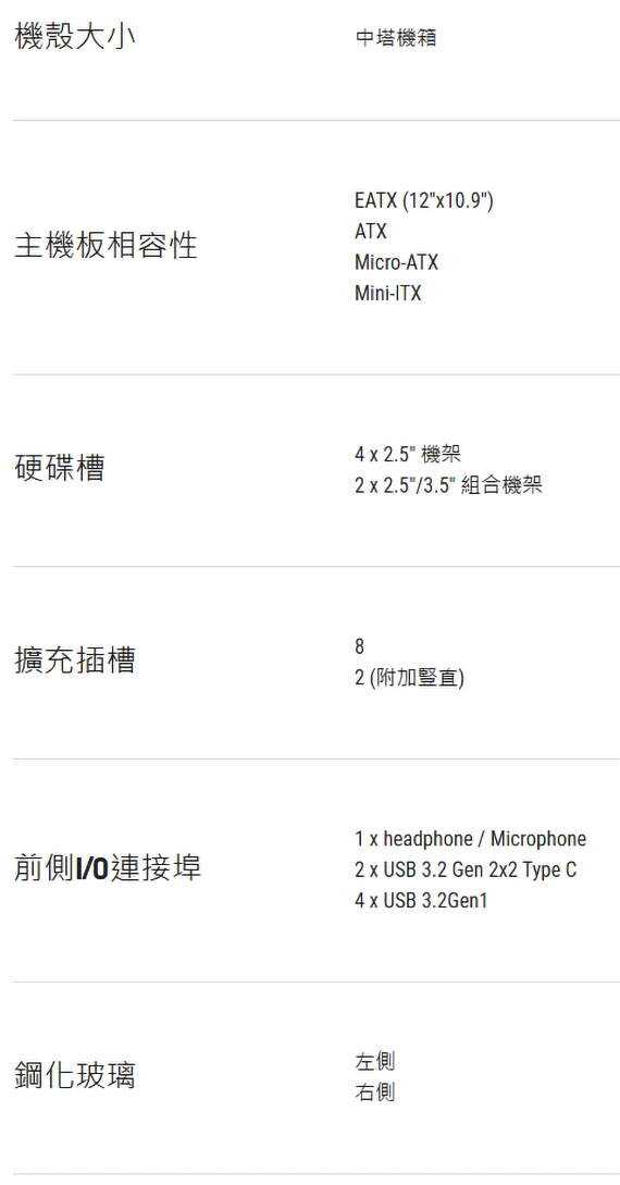 2.5吋/3.5吋*2, 2.5吋*4,支援主機板:ATX,micro ATX, Mini ITX,EATX,擴充槽*8+2,支援風扇:上板120mm*3/140mm*2,前板120mm*3/140mm*3,後板120mm*1/140mm*1, 支援水冷:上板120/140/240/280/360mm,前板120/140/240/280/360/420mm,後板120/140mm,I/O面板:headphone/Microphone*1,USB 3.2 Gen2*2,Type C*2,USB 3.2Gen1*4, ARGB 燈效控制按鈕*1,風扇轉速PWM控制按鈕*1,尺寸:250*565*591mm,鑽石菱格網孔設計,搭配3D立體結構濾網,保固二年