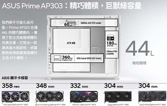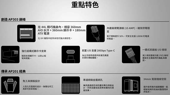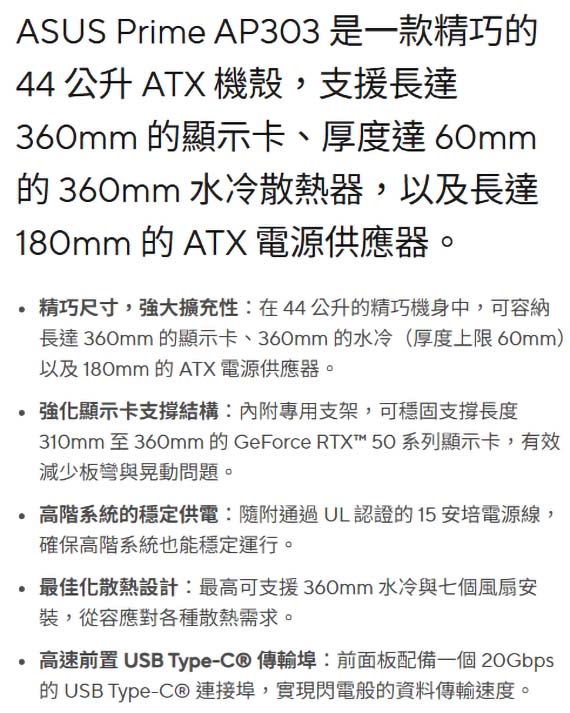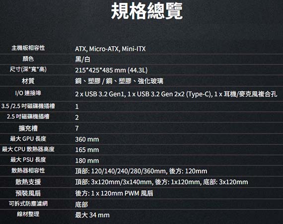 3.5吋/2.5吋*1,2.5吋*2,適用主機板:ATX/Micro-ATX/Mini-ITX,PCI擴充槽*7,CPU散熱限高165mm,顯卡GPU限長360mm,電源供應器PSU限長180mm,支援風扇(無標示內建即選購):後板120mm*1(內建120mm PWM*1)、頂部120mmm*3/140mm*3、底部120mm*3,支援水冷(選購):頂部120/140/240/280/360mm、後板120mm,I/O介面:USB3.2 Gen1*2、USB3.2 Gen2x2(Type-C)*1、音訊孔,44公升,34mm的收納空間,強化顯示卡支撐結構,2年保固