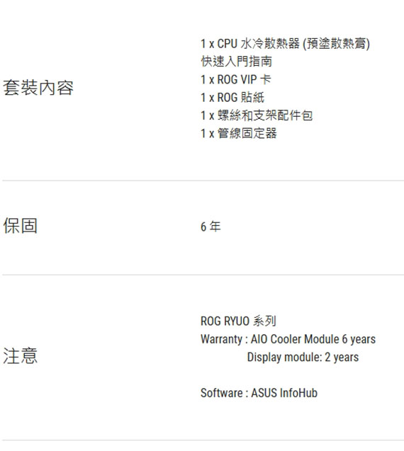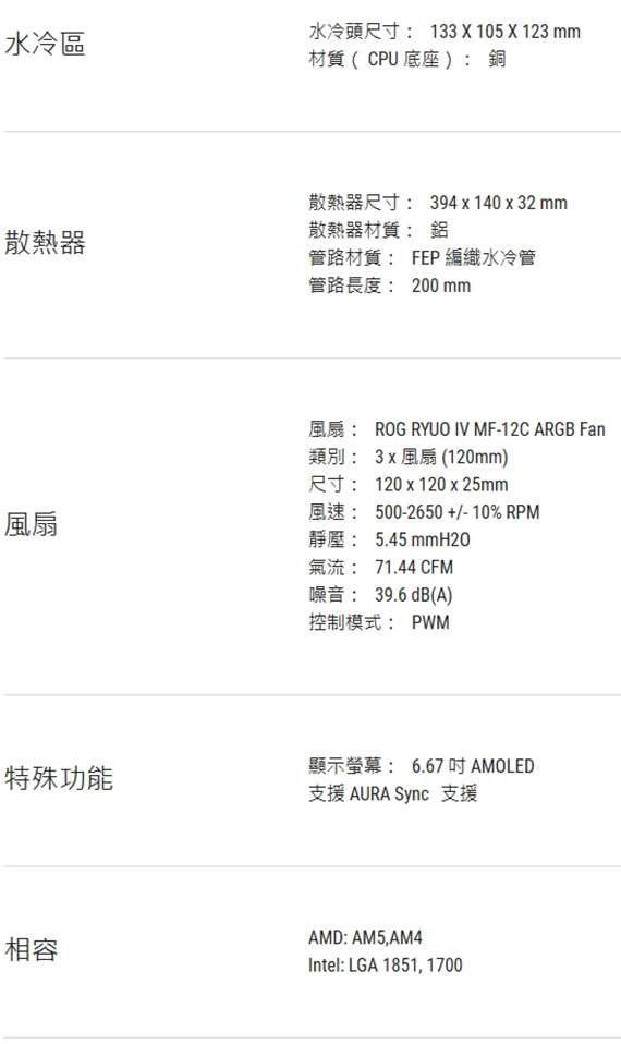 Intel:LGA 1851/1700、AMD:AM5/AM4、PCI擴充槽*4、ROG RYUO IV MF-12C ARGB風扇、尺寸120x120x25mm、風量71.44CFM、轉速500~2650RPM±10%、噪音值39.6dBA、靜壓5.45mm-H2O、可移動曲面6.67吋AMOLED螢幕、預先安裝的磁吸式串聯ARGB風扇、縮短的水冷管設計、六年保固