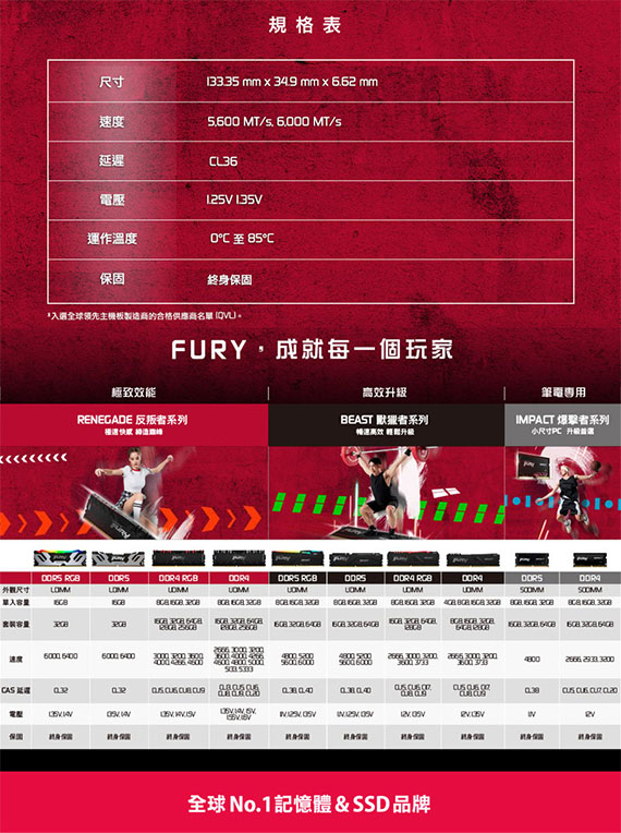 頻率:DDR5 6000,針腳及模組:288-Pin DIMM,顆粒:2Rx8,CL值:36,工作電壓: 1.35V,Non-ECC Unbuffered, Intel XMP3.0/AMD EXPO 認證, 終身有限保固