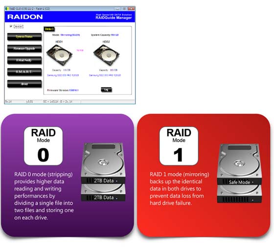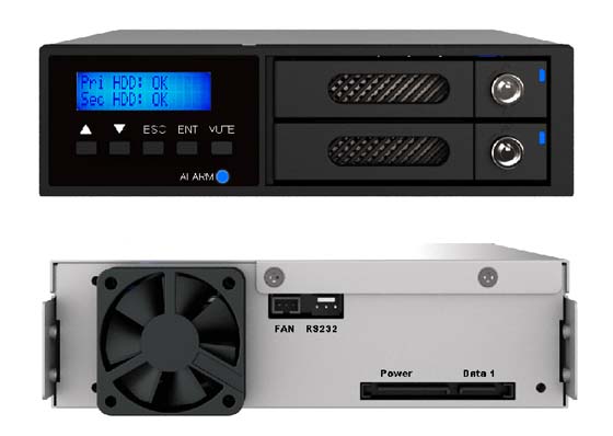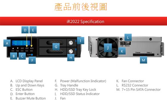提供安裝2個2.5吋 SATA6.0 Gb/s硬碟和選擇鏡像RAID 1功能,備份和及時保護數據資料,支援RAID 0從而提高讀取功能與寫入速度,支援5.25吋光碟機大小,內建 RS232 端口的功能能監控與傳送硬碟狀態,配備了LCD顯示和操作過程中的LED系統監測指標,具備 4公分的靜音風扇,二年保固