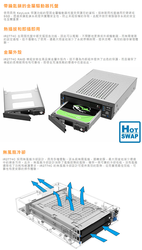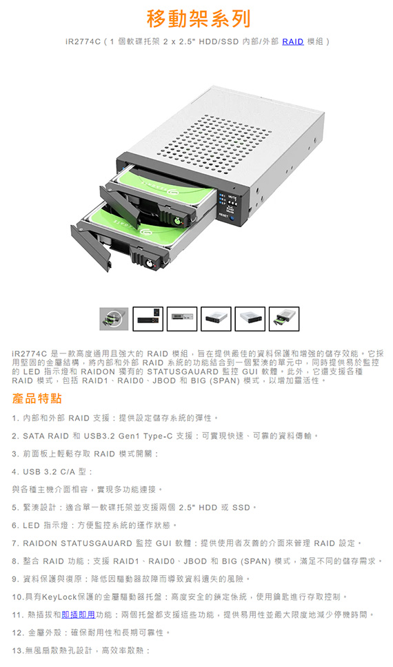 【上一個】【下一個】 | RAIDON InTANK iR2774C-S3 2-Bay Type-C 2.5吋 HDD/SSD 磁碟陣列內接/外接模組
