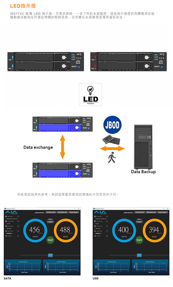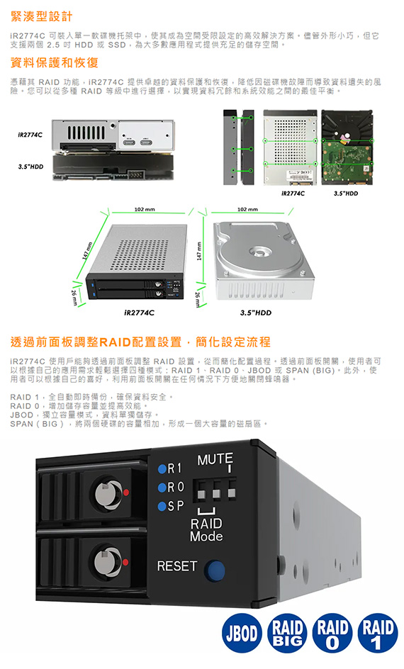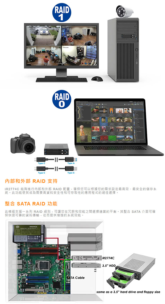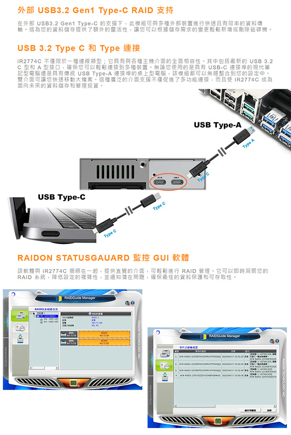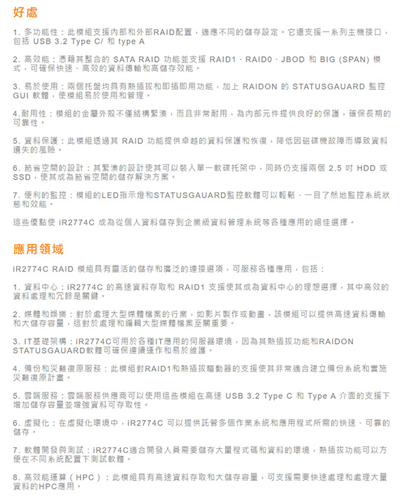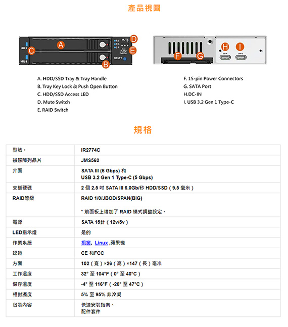 支援SATA RAID與Type-C USB3.2 Gen2,內接與外接都適用,內接適合單一軟碟托架。支援2顆硬碟,支援2.5吋HDD或SSD。四種RAID模式: RAID 0、RAID 1、JBOD 和 SPAN(BIG),JMS562晶片。提供易於監控的LED指示燈和RAIDON獨有的STATUSGAUARD監控GUI軟體,前面板上輕鬆存取RAID模式開關,具有KeyLock保護的金屬驅動器托盤,金屬結構,無風扇,尺寸147x102x26mm(長x寬x高),產品本體(不含硬碟)
