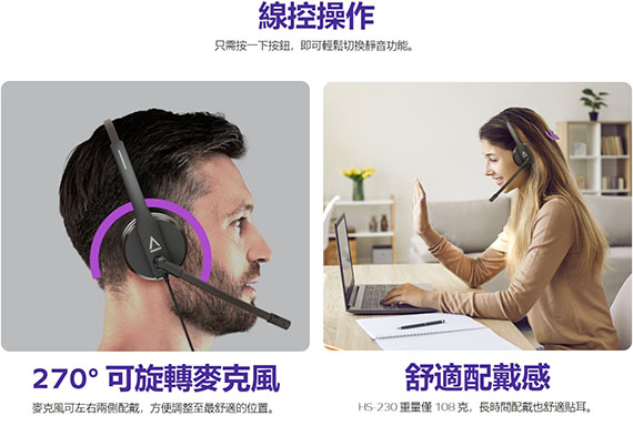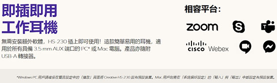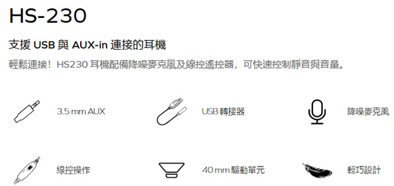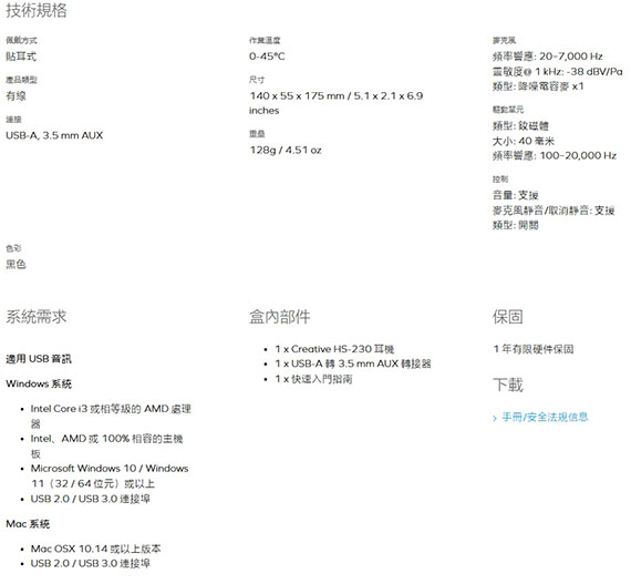 耳戴/耳罩式/護耳式/全罩、40mm釹磁體驅動單元、連接:USB-A,、3.5 mm AUX、270° 可旋轉麥克風、線控操作、即插即用工作耳機、舒適配戴感、強勁音效、適用各種用途、降噪電容麥、包裝內容:1 x Creative HS-230 耳機 /1 x USB-A 轉 3.5 mm AUX 轉接器/1 x 快速入門指南