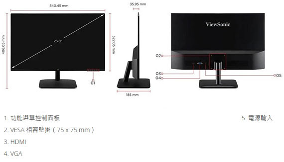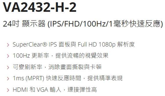 ViewSonic優派 VA2432-H-2 黑色 24型 16:9 23.8吋 螢幕 (IPS/1ms/100Hz/1A1H/抗藍光零閃屏)