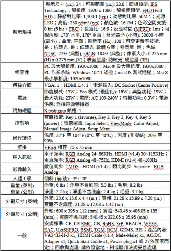 23.8吋,16:9寬螢幕,LED,IPS面板,解析度1920X1080(Full HD 1080P),100Hz更新率,反應時間1ms(GTG),對比1300:1/50000000(動態),亮度250cd/m2,輸入介面:VGA*1/HDMI 1.4*1,支援HDCP,壁掛裝置(VESA),無閃爍技術和濾藍光,三邊超薄邊框