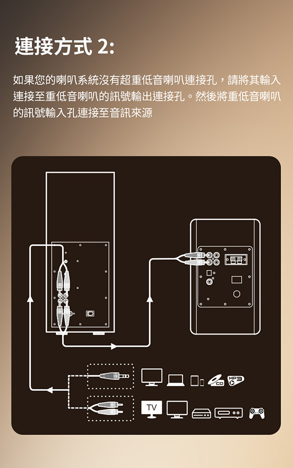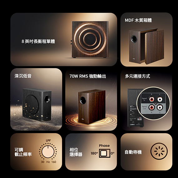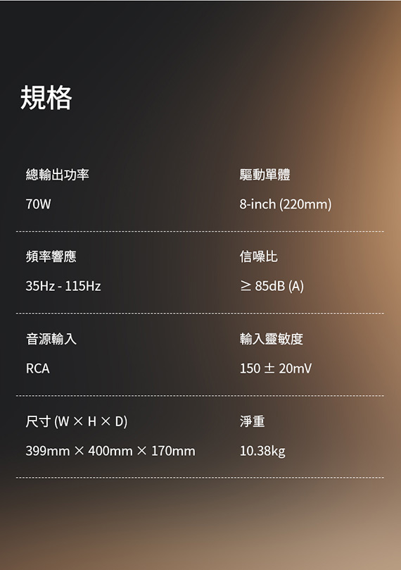 70W RMS強勁低音,驅動單元:8英吋長衝程單體,訊號源:RCA in/out,多元匹配模式:可調截止頻率、相位切換,自動待機模式,低失真設計,節省空間,信噪比:?85dB(A),保固:15個月(人為因素不包含在內)