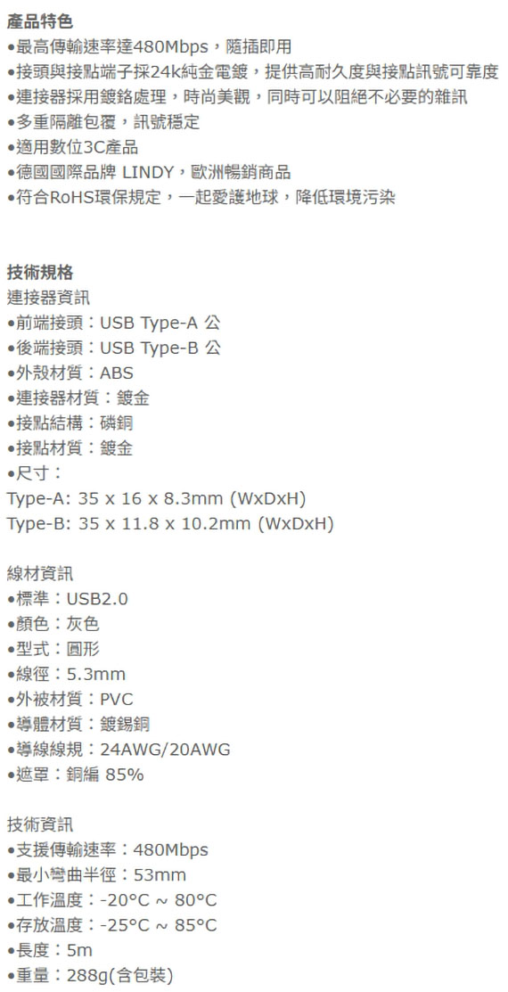 USB 2.0,A公<-->B公,線長:5公尺(5米)/500公分(500cm),CROMO鉻系列,連接器採用鍍鉻處理,接頭與接點端子採24k純金電鍍,多重隔離包覆,傳輸速率達480Mbps,適用數位3C產品/車用3C產品,符合RoHS環保規定