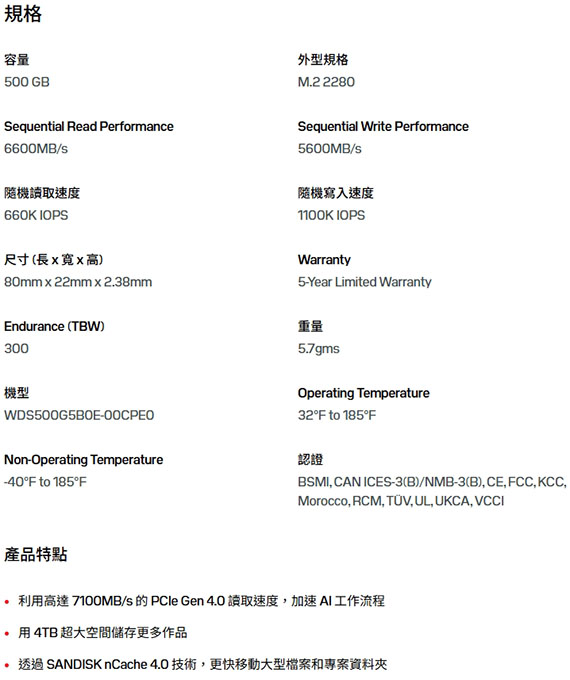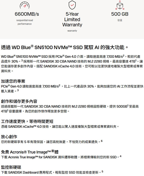 PCIe Gen 4.0介面,寫入速度高達6600MB/s,讀取速度高達6600MB/s, SANDISK nCache 4.0 技術,新一代 SANDISK 3D CBA NAND 技術,免費 Acronis True Image軟體,五年保固