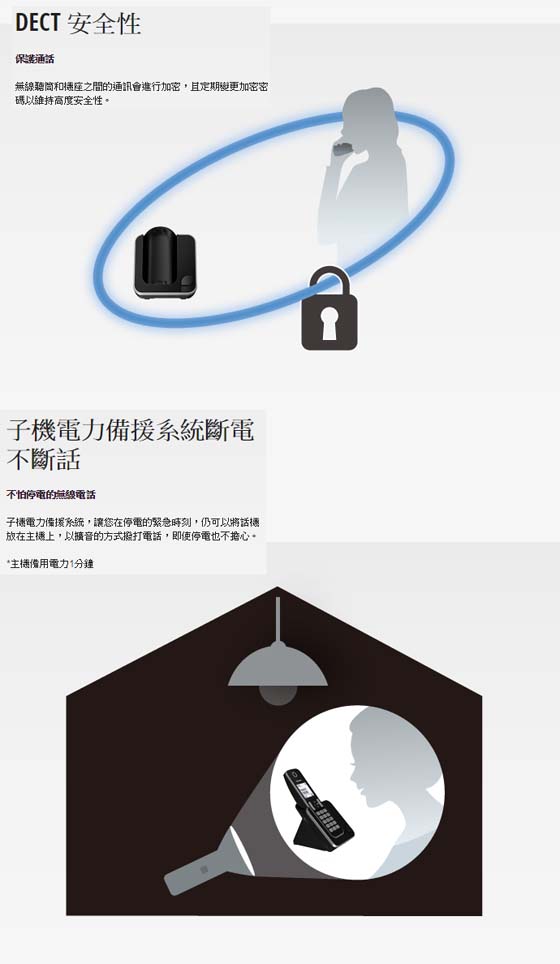 Panasonic國際 KX-TGD310 DECT數位無線電話 1.8吋顯示螢幕,中文功能顯示,120組英文姓名電話簿,免持聽筒,DECT通訊更安全的加強加密,螢幕背光與鍵盤燈、鍵盤鎖定,單鍵節能模式,馬來西亞製造,NCC許可字號:CCAB15E1013BT2 商品已下架 |