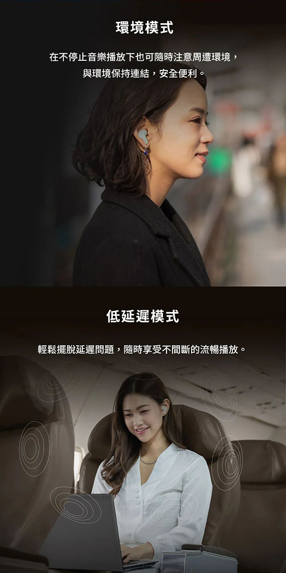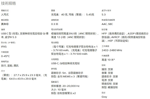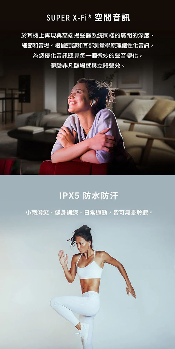 入耳式(耳道)、10mm釹磁體發聲單元、藍牙5.3、自適應主動降噪、主動降噪模式、環境模式、Super X-Fi空間全息技術、支援多點連接功能、IPX5防水、總播放時間長達39小時、單次充滿電可使用12小時、低延遲模式 、調整自我主動喚醒 (ANC)