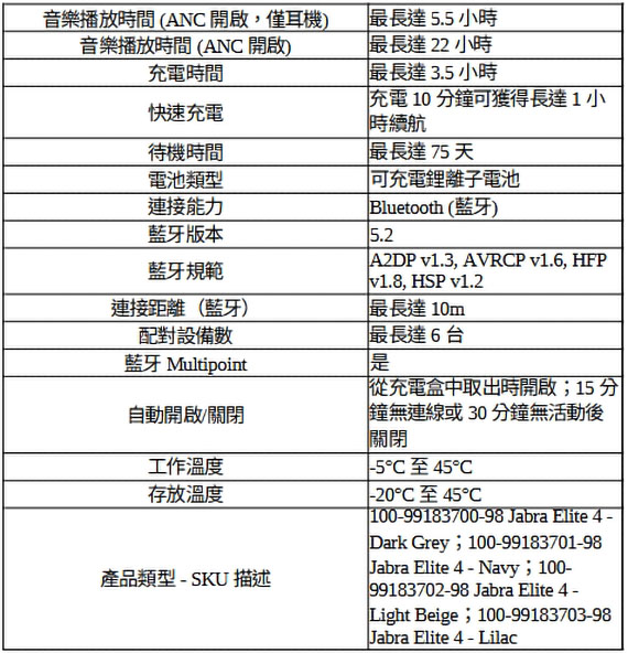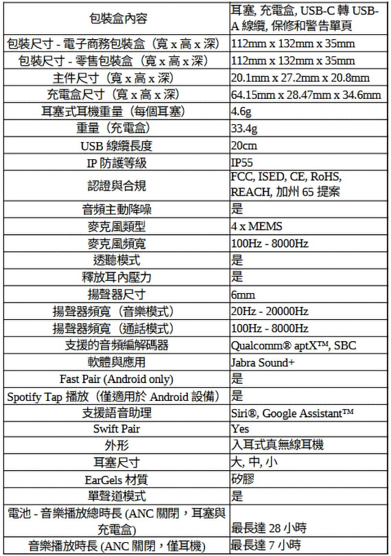 入耳式(耳道),驅動單元6mm,藍牙Bluetooth5.2,可配對6台設備,ANC主動降噪,4個MEMS麥克風,通話降噪,可充電鋰電池,USB-C轉USB-A線,續航力(音樂播放):含充電盒約28小時,單聲道模式,支持Alexa語音助理,IP57防水等級,二年保固 NCC認證碼: CCAH21LP7590T6