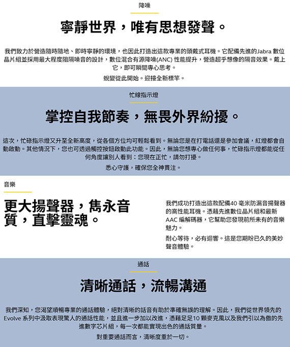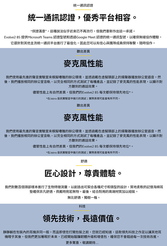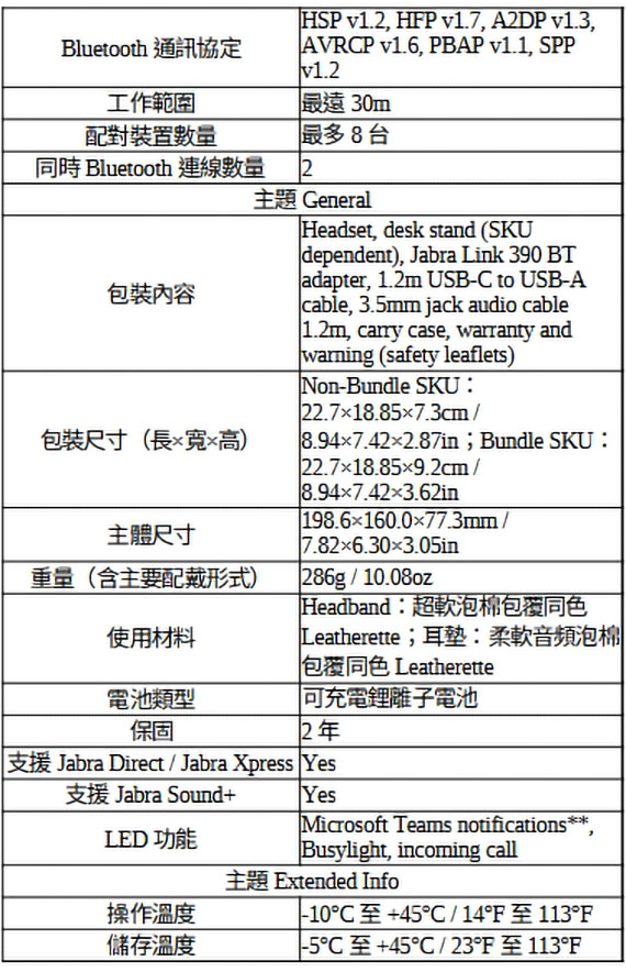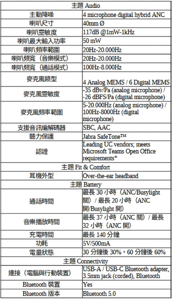 耳戴/耳罩式/護耳式/全罩,驅動單元40mm,功率:50mW,USB-A接收器/藍牙Bluetooth 5.0,3.5mm插孔連接,同時連接兩個藍牙設備,內建6個數位MEMS、4個類比MEMS的麥克風,耳機上音效控制器,可充電鋰電池,續航力長達37小時,被動降噪,忙碌指示燈,Microsoft Teams、Zoom、Avaya、Cisco...等認證,含充電座,保固2年