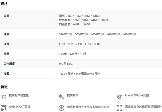 頻率:DDR5 6000,針腳及模組:288-Pin DIMM,顆粒:1Rx8,CL值:36-44-44,工作電壓:1.35V,記憶體配置:32GB(1x32GB),模組類型:Non-ECC Unbuffered,支援技術:AMD EXPO v1.1、Intel XMP 3.0,終身有限保固