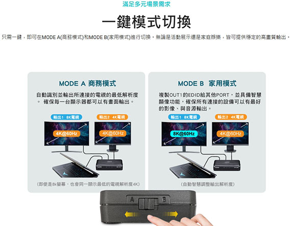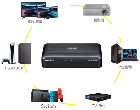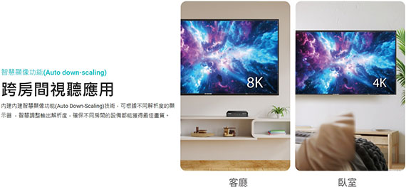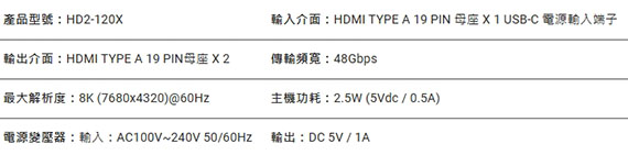 輸入介面:HDMI,輸出介面:HDMI*2,相容HDCP 2.3,智慧顯像功能,USB-C 電源輸入,頻寬達48Gbps,可支援HDR與non-HDR的顯示器同時出,一鍵模式切換,直覺式操作介面,8K沉浸式觀影體驗