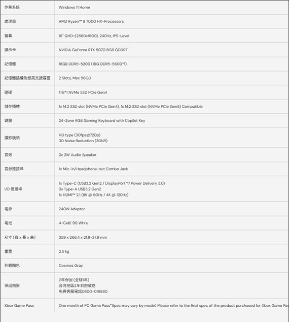 16吋,QHD+(2560x1600),16:10,240Hz更新率,IPS等級,AMD Ryzen 9 7945HX,16GB DDR5-5600 2Slots(Max 96GB),1TB NVMe SSD PCIe Gen4,光碟機外接請選購,NVIDIA GeForce RTX 5070 Laptop GPU 8GB GDDR7,Gigabit,Wi-Fi 6E,藍牙5.3,Type-A USB3.2 Gen1*3,Type-C*1,HDMI 2.1*1,HD type (30fps@720p),音源孔*1,2.5kg,Windows 11家用版64位元,二年保固 (Crosshair A16 HX D7WGKG-044TW-GBAR979X16GXXDX11MA)