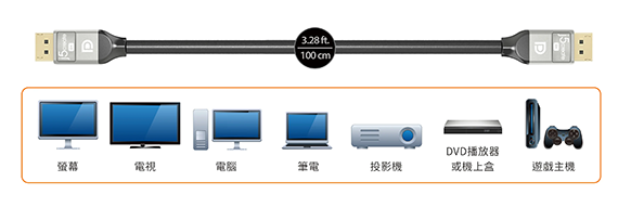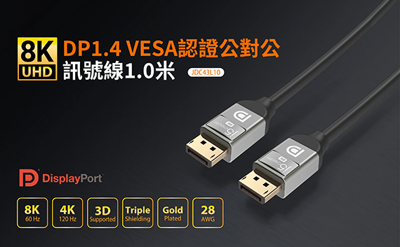 Display Port,1.4版,Display Port公<-->Display Port公,線長:1公尺(1米)/100公分(100cm),塑殼鍍金接頭,支援最高解析度7680x4320@60Hz、4096x2160@120Hz、1080p 3D,支援HBR3,最大頻寬達32.4Gbps,通過VESA DP 1.4認證,向下相容DP1.2/1.1/1.0,按壓卡鉤設計,保固2年