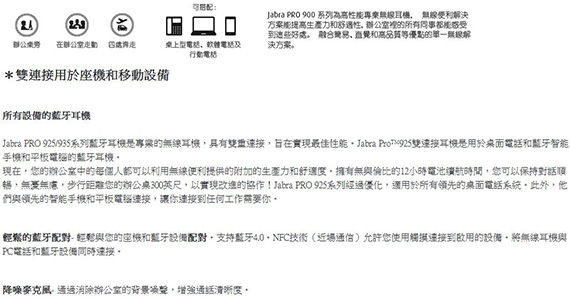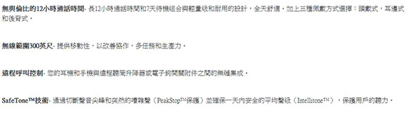 型式:耳戴/耳罩式/小耳罩,28mm驅動單體,藍牙連接,傳輸距離最長達100m,單一指向麥克風,具NFC功能,續航力長達12小時,遠程呼叫控制,SafeTone技術,適用於桌面電話/手機/平板