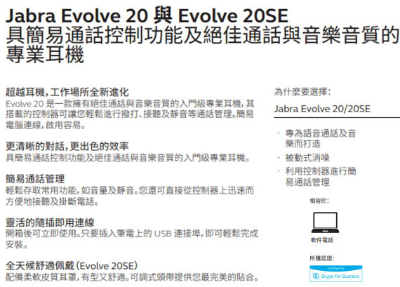 Jabra Evolve 20 SE MS Stereo 頭戴式 耳機麥克風(DUO雙耳)(微軟SKYPE for 企業版專用) 4999-823-309