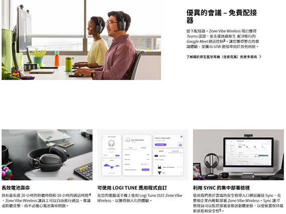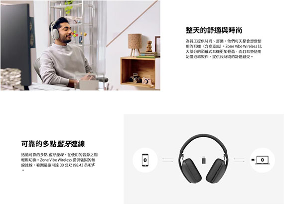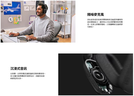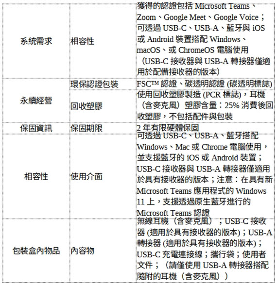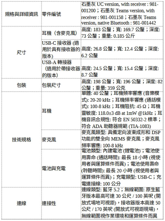 耳戴/耳罩式/護耳式/全罩、40mm單體、藍牙5.2、USB-C接收器(附USB-A轉接器)、USB-C充電、續航力約18~20小時、耳墊使用記憶海綿製成、具有波束成形技術的隔噪麥克風、可靠的多點藍牙連線、專為偏好使用具有商務等級功能的頭戴式耳機的現今工作者而設計、981-001158
