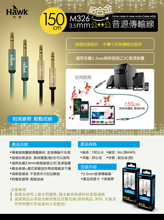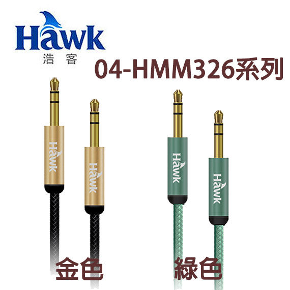 HAWK 04-HMM326 PB綠色 M326 3.5mm公-3.5mm公 立體聲(二環) 鋁合金 1.5M 耳機線材