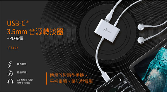 j5 create JCA122 USB-C 3.5mm音源轉接器+PD充電 Type-C公-3.5mm