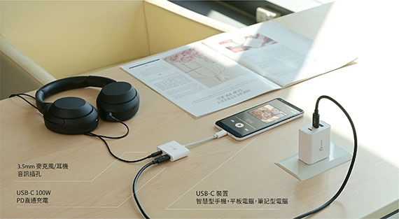 JCA122可為您的設備擴充一個3.5mm音訊接口與一個USB-C PD充電口,適用於USB-C手機/筆電/平板電腦等裝置,解決沒有3.5mm音訊接口或接口已損壞的問題。
