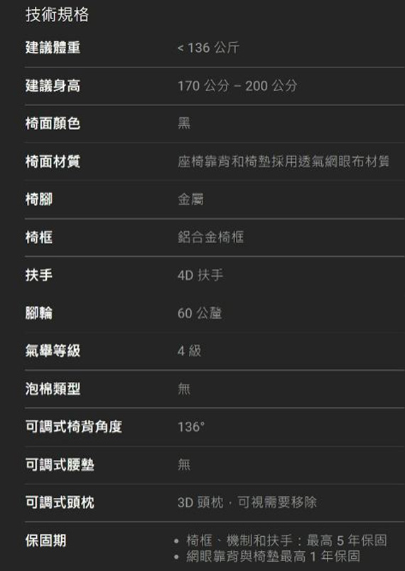 超耐用透氣網眼布、4D軟墊扶手、最大承重136公斤、安全4級氣壓棒、60mm腳輪、鋁合金椅框、可後仰130°的同步傾斜技術、可調整高度的腰部支撐、附風靈頭枕、保固五年(尼龍椅框、機制和扶手)、保固一年(網眼靠背與椅墊)