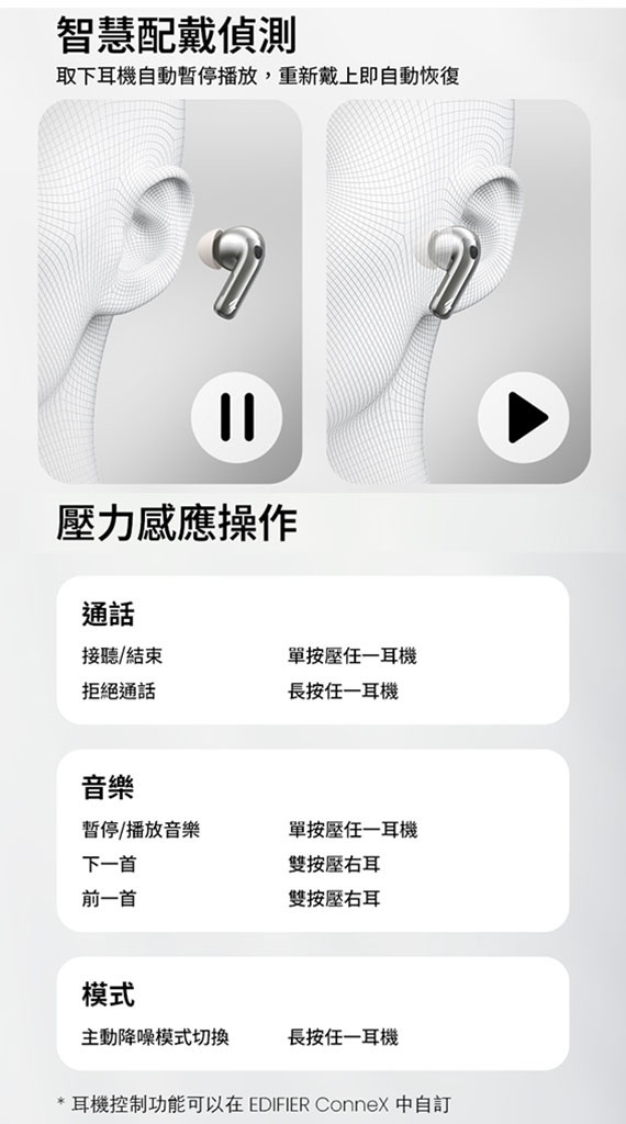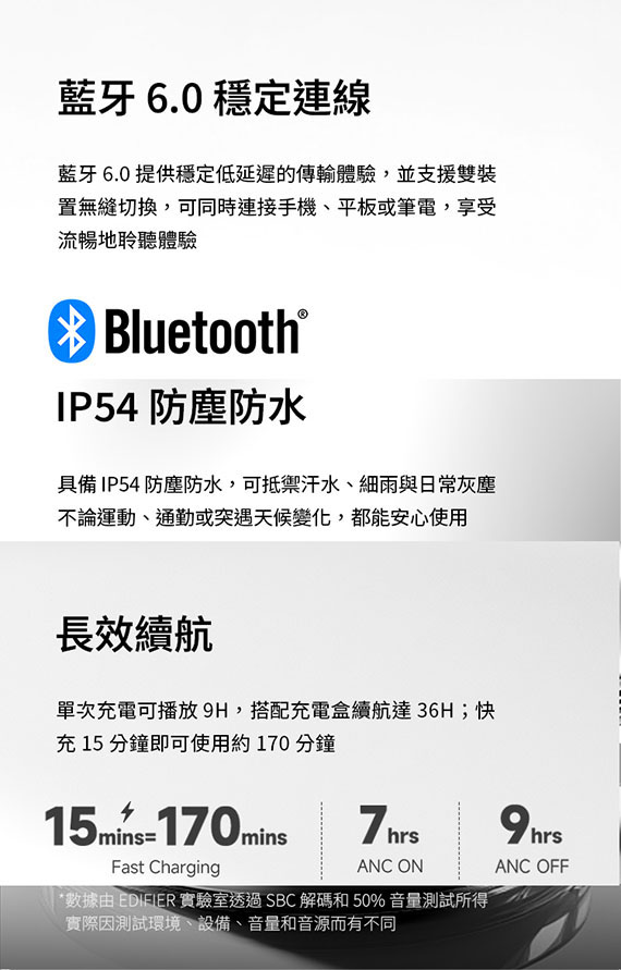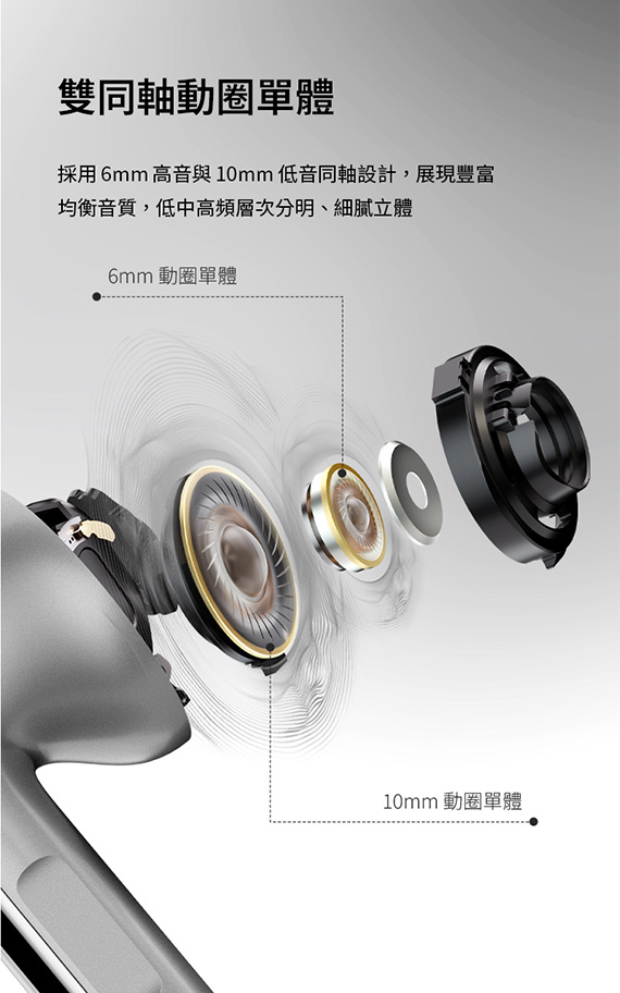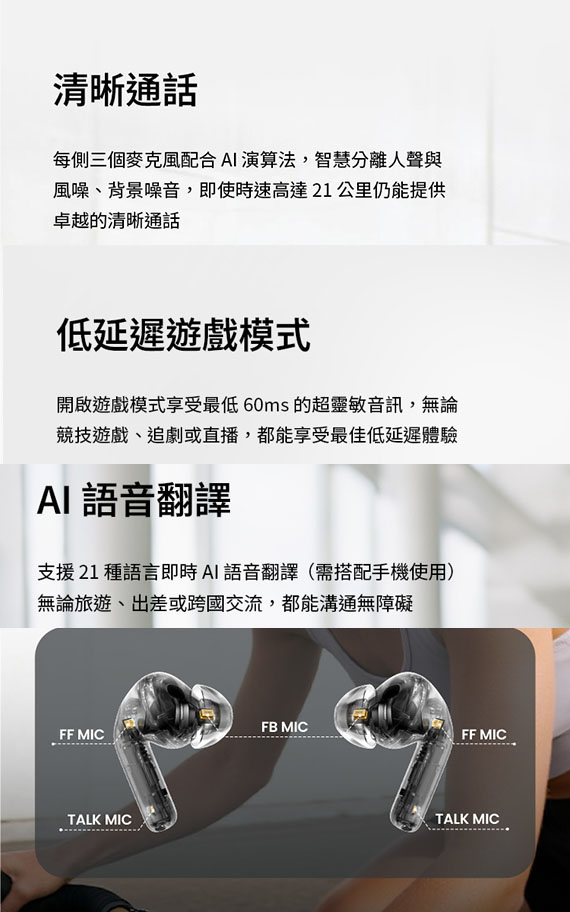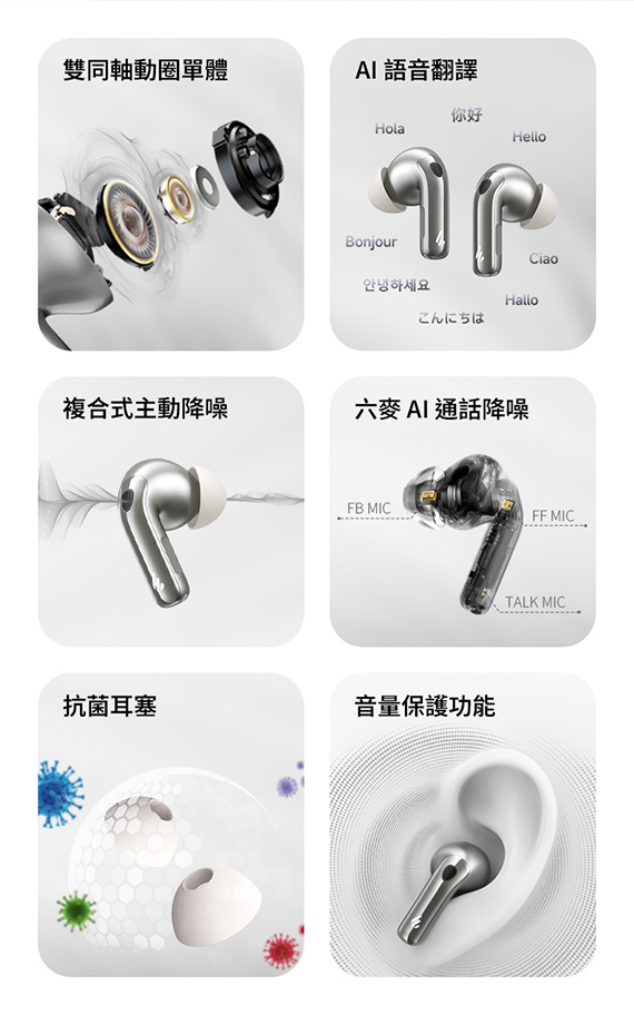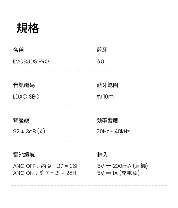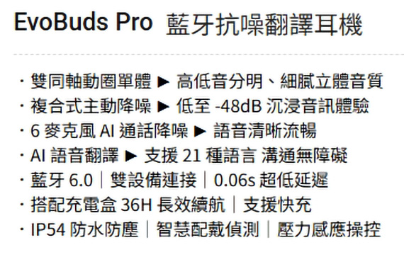 入耳式(耳道),6mm+10mm雙同軸動圈驅動單體,藍牙6.0,Type-C充電,工作時間:ANC OFF約36H、ANC ON約28H,IP54防塵防水,智慧配戴偵測,壓力感應操控,雙設備連接,0.06s 超低延遲,AI語音翻譯,支援21種語言,6麥克風AI通話降噪,複合式主動降噪,專用APP,NCC:CCAP25LP4150T0 (左耳) CCAP25LP4140T7 (右耳),BSMI:R3B489