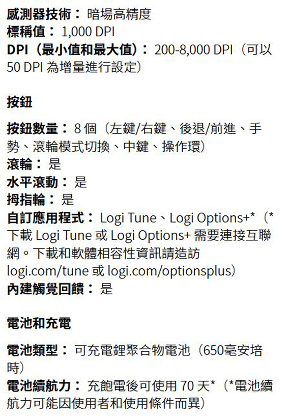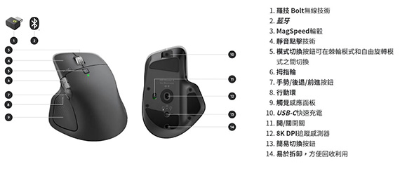 相容於 USB-C 與 USB-A 接收器,藍牙低耗電技術,雙模連線,自定義8個按鍵,最高8000DPI,Darkfield 高精確度感應器,一次充電可使用長達70天,保固二年 (910-007622)