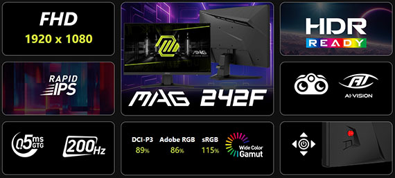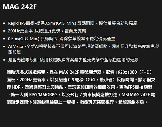 MSI微星 MAG 242F 24型 16:9 23.8吋 電競螢幕 (IPS/0.5ms/200Hz/1H1DP)