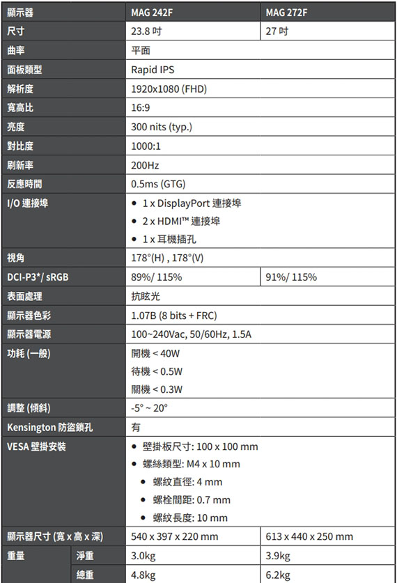 23.8吋,16:9寬螢幕,Rapid IPS,1920x1080(FHD),更新率30~230 KHz(H)/48Hz~200Hz(V),0.5毫秒(GtG最小值)反應時間,動態對比度100000000:1,亮度300cd/m2,輸入介面:1*HDMI(2.0b)、1*DisplayPort(1.2a),支援HDCP,耳機孔,防閃爍,減藍光,全新AI視覺技術