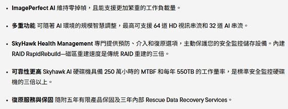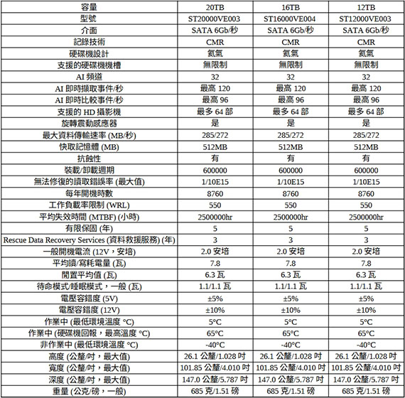 SATA 6Gb/s介面,轉速:7200RPM,512MB快取記憶體,Image Perfect AI完美AI影像技術,RV旋轉震動感應技術,氦氣密封鍛造技術,最大資料傳輸速率(MB/秒)285/272,3.5吋外觀規格,五年有限保固,內含資料救援計畫3年服務
