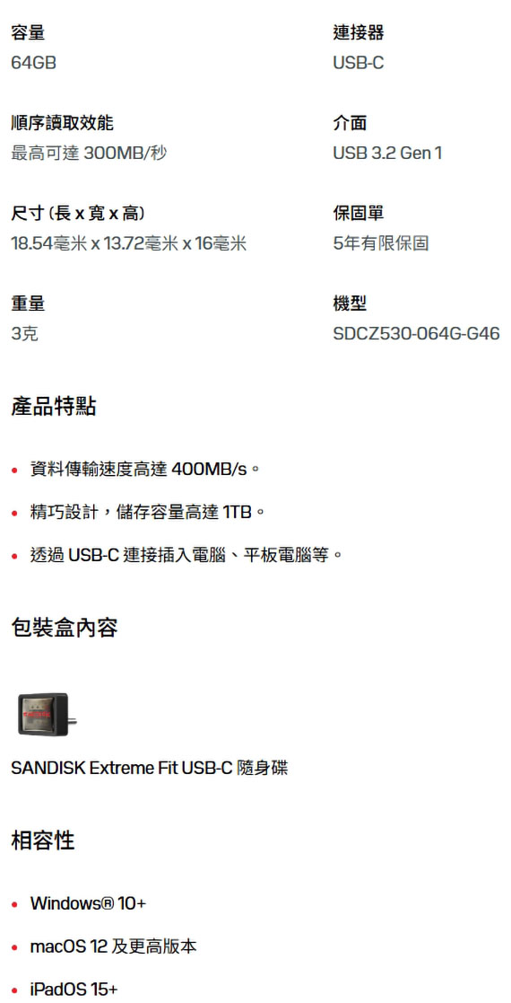 USB-C連接,USB 3.2 Gen 1介面,讀取高達300MB/秒,尺寸(長*寬*高)18.54*13.72*16mm,3克重,從未有過的輕巧體驗,SANDISK應用程式,5年有限保固,SDCZ530-064G-G46